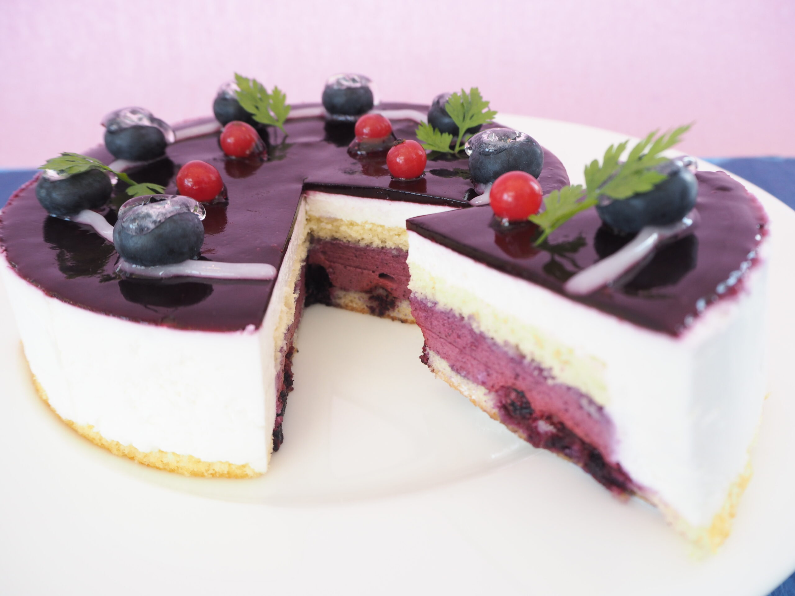 レアチーズクリームの中にブルーベリームースを閉じ込め、表面に光沢のあるブルーベリーのゼリーを流した夏でもさっぱりいただけるホールケーキに仕上げました。