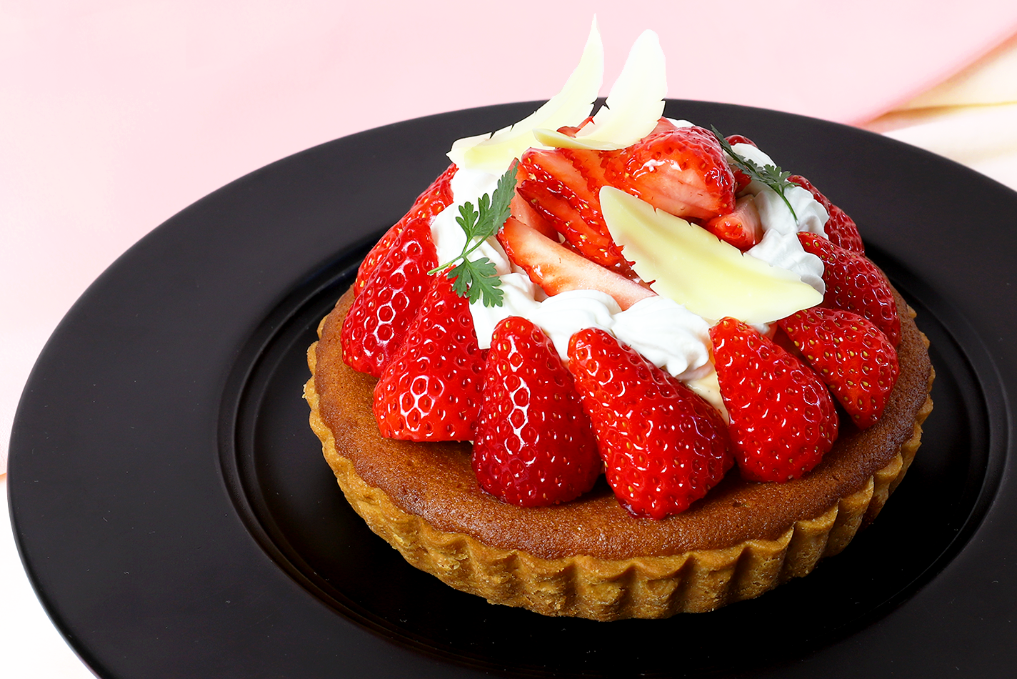 苺のコンフィチュールをアーモンドクリームの中に入れ焼き上げたタルト台の上に、苺のムースを乗せカスタードクリームを絞り