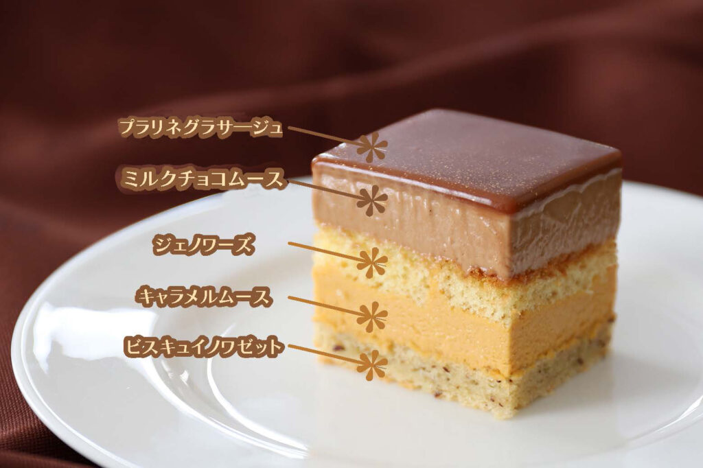 コーヒー入りのミルクチョコレートムースとほんのり塩をきかせたキャラメルムースを重ね、プラリネを使ったグラサージュをかけたケーキです
