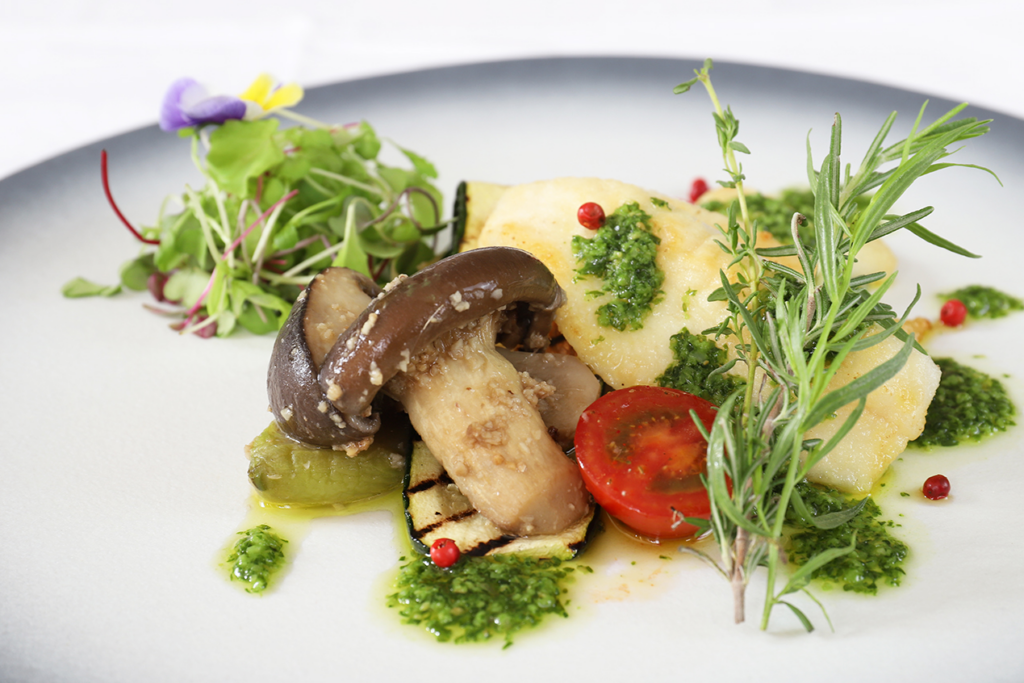 白身魚のポワレ エスカルゴバターソース ~きのこと秋茄子のマリネ添え~