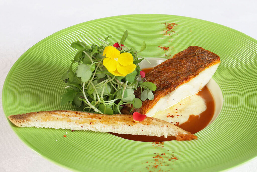 白身魚のポワレ 〜海老のビスクと長ネギのフォンデュのクリームソース〜