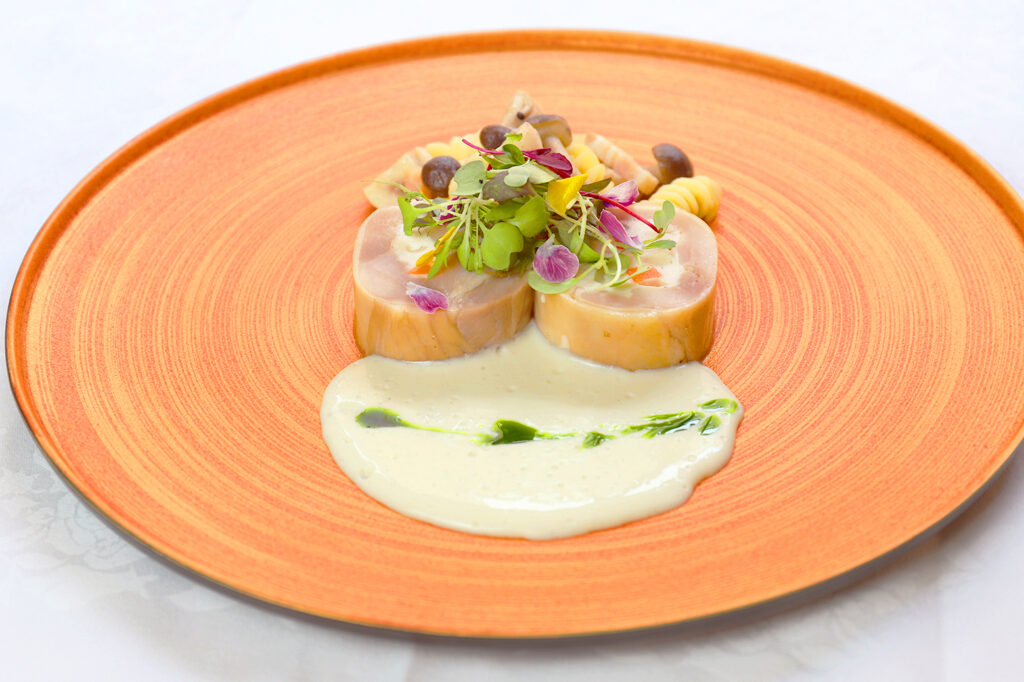 鹿児島産森林鶏腿肉のバロティーヌ 様々な貝類のカマンベールクリームソース ショートパスタと茸のフリカッセを添え バジルオイルでアクセント