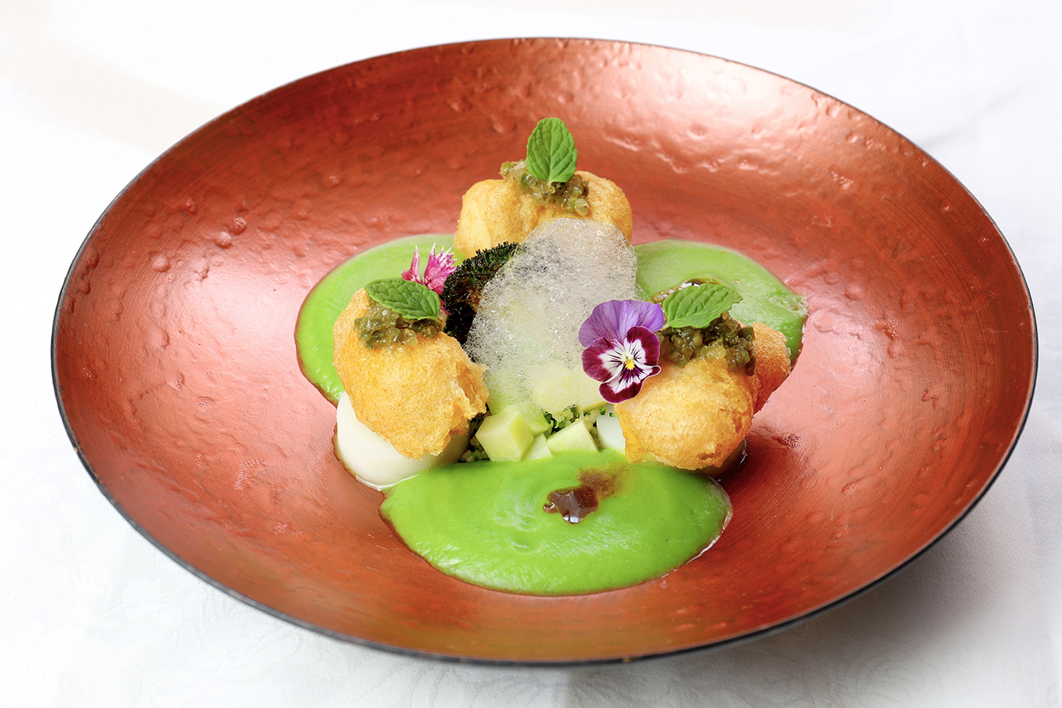 鮟鱇の全粒粉ベニエ ブロッコリーのデクリネゾン【滑らかなピュレ/スムール/素揚げ】シトロエンキャビアのコンディモンとレモングラスエキュームでエスコート カレーオイルの香り