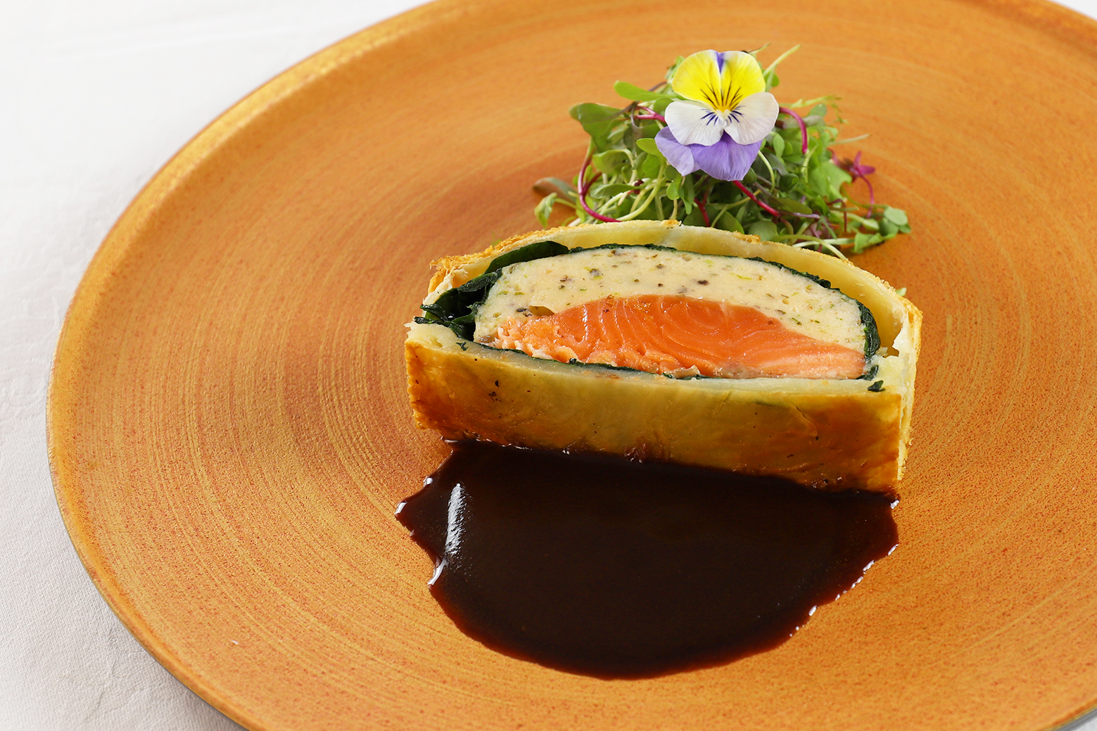 帆立貝と浜名湖産ぶち海苔のムースを纏わせたパイ包み焼き